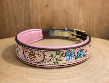 Une collection ou chaque collier est réalisé en pièce unique. Cuir repoussé, cousu et peint à la main.